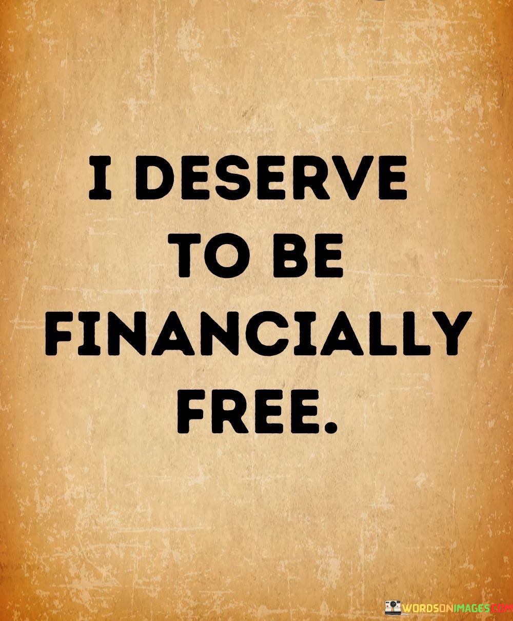 This quote, "I Deserve To Be Financially Free," conveys a strong belief in one's right to achieve financial independence. It signifies the idea that each individual has the potential and should strive for a life where they are not constrained by financial limitations. It's like recognizing that you have the ability and deserve the opportunity to break free from financial burdens and enjoy a more secure and prosperous existence.