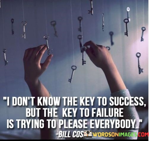 The statement "I don't know the key to success, but the key to failure is trying to please everybody" underscores the idea that attempting to satisfy everyone often leads to unsuccessful outcomes. It suggests that seeking approval from everyone can hinder progress and undermine personal goals.