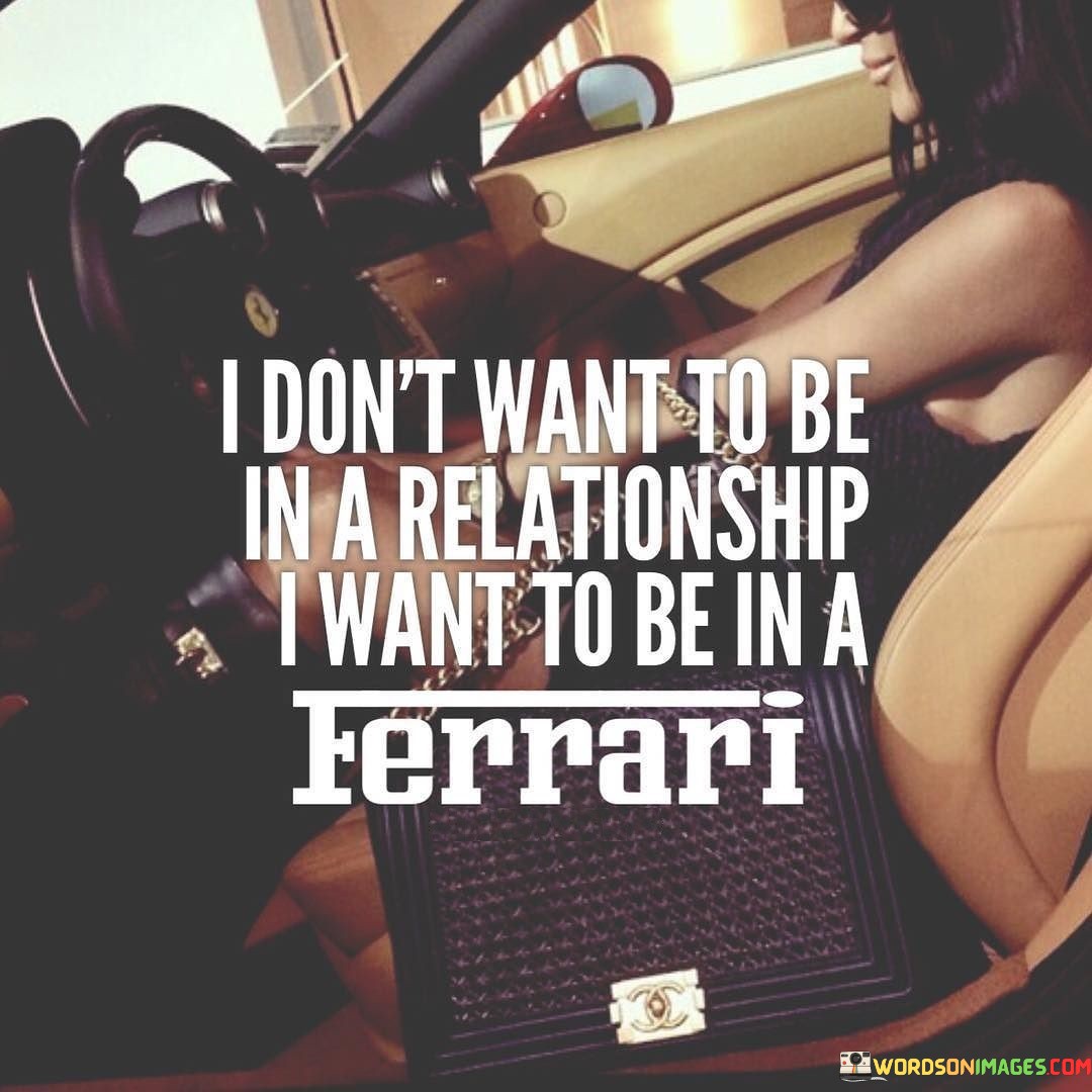 The statement "I don't want to be in a relationship, I want to be in a Ferrari" expresses a humorous and playful perspective on personal priorities and desires.