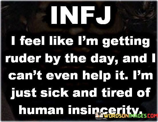 The quote expresses frustration with changing behavior due to negative experiences. "Going ruder day by day" signifies a shift in attitude. "Sick and tired of human insincerity" reflects disillusionment with dishonesty. The quote conveys the weariness of dealing with insincere interactions.