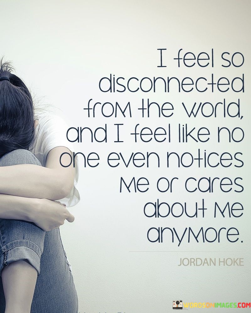 The quote expresses isolation and emotional neglect. "Disconnected from the world" implies detachment. "No one notices me or cares" signifies perceived neglect. The quote conveys the deep sense of loneliness and insignificance the speaker is experiencing.