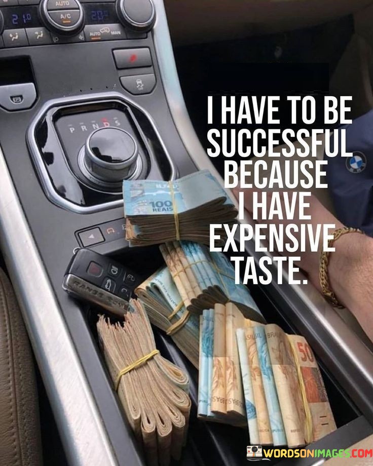 The statement continues with "because I have expensive taste," which bluntly expresses the speaker's preference for high-end and costly possessions. It suggests that the pursuit of success is directly linked to their desire for a lavish lifestyle.