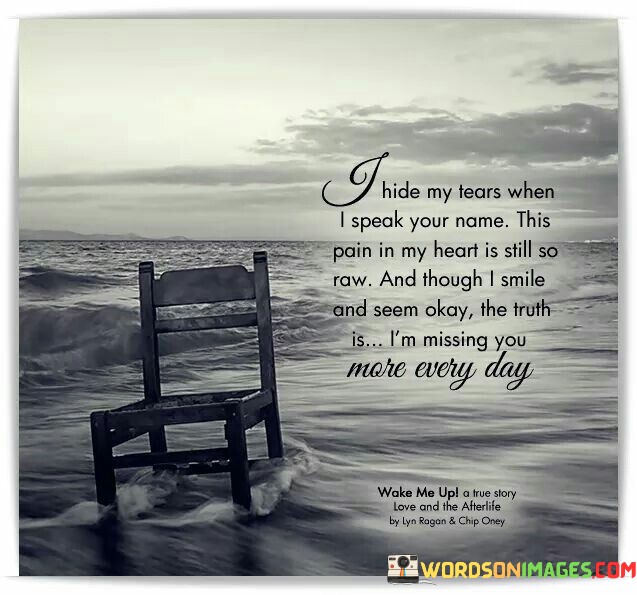 The quote underscores the contrast between appearance and inner turmoil. It highlights the facade of a smile while concealing inner pain. "Missing you more every day" emphasizes the persistent yearning and the inability to fill the void left by the absence.