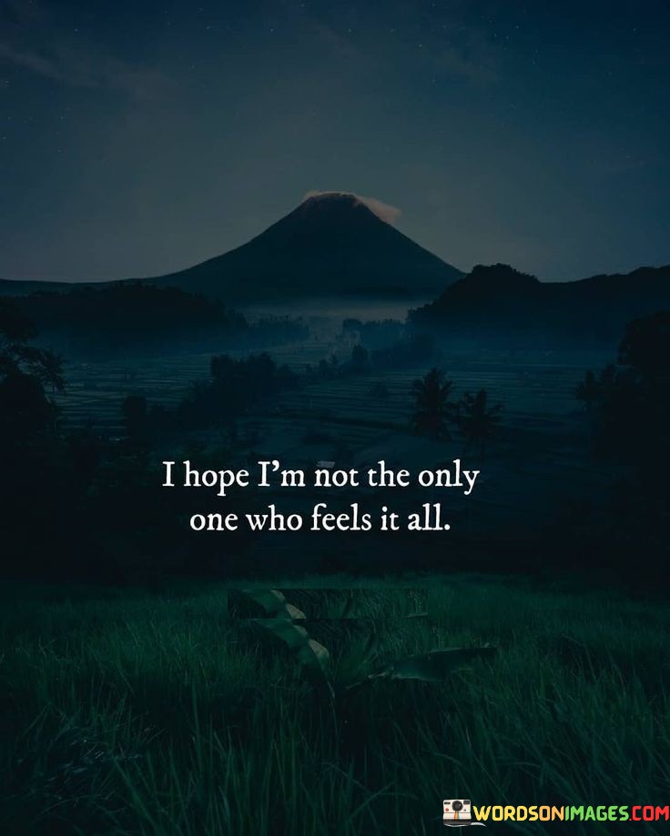 This quote, "I hope I'm not the only one who feels it all," expresses a common human desire for connection and understanding. The person saying this hopes that their emotions and experiences are not unique to them, that others share similar feelings. It's like when you're going through something, and you wish someone else can relate to what you're going through. This quote highlights our fundamental need to know that we're not alone in our emotions and struggles.