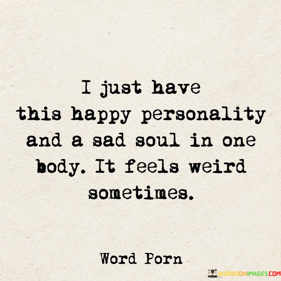 The quote reflects on the duality of emotions within oneself. "Happy personality and a sad soul" implies conflicting emotions. "Feels weird sometimes" underscores the internal contrast. The quote conveys the complexity of harboring both joy and sorrow simultaneously.