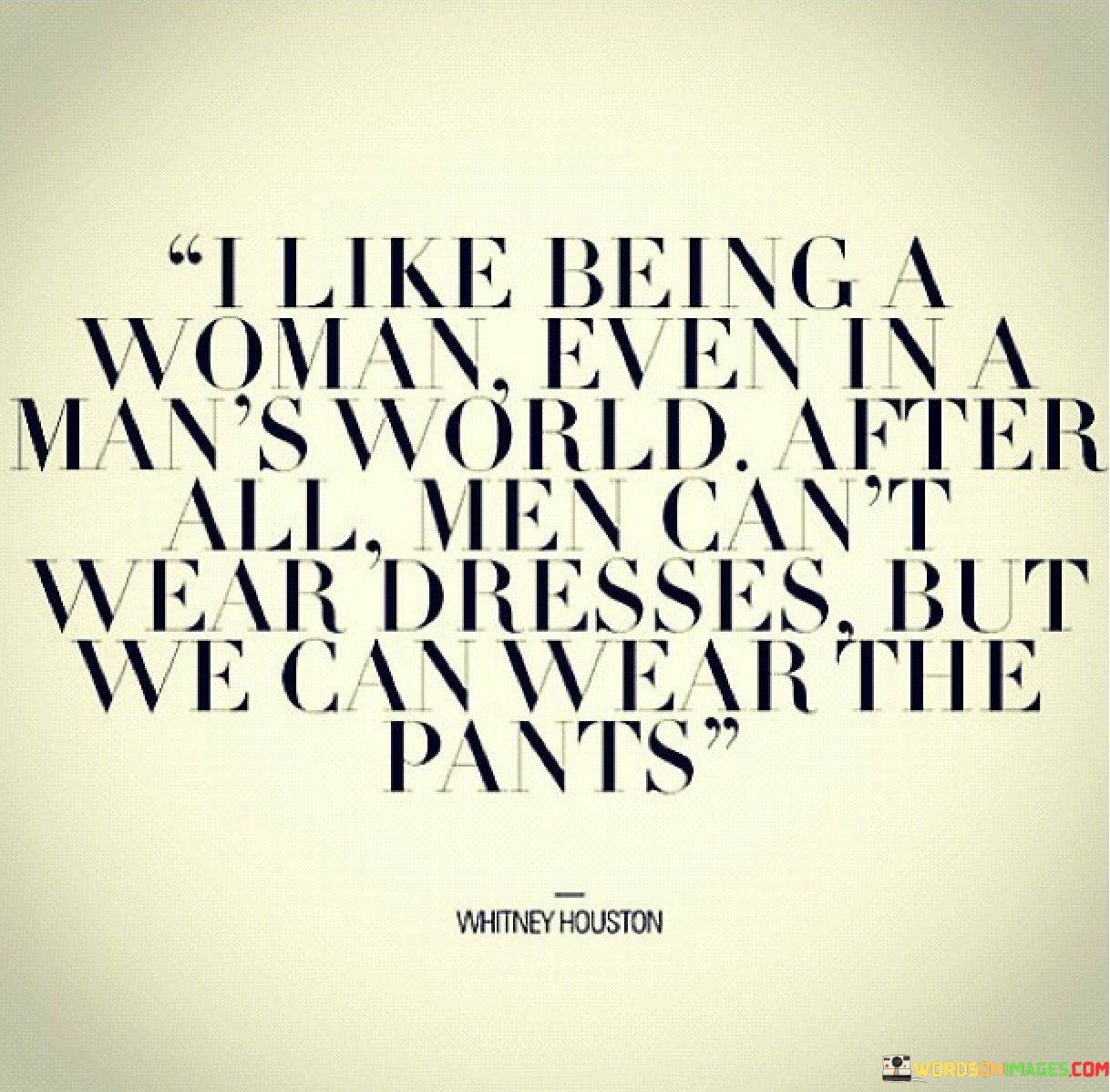 This witty and empowering quote celebrates the unique strengths and advantages of being a woman in a society that historically has been dominated by men. The speaker expresses pride in her identity as a woman and appreciates the opportunities and freedoms that come with being female. By saying, "I like being a woman even in a man's world," the quote acknowledges the existence of gender disparities and inequalities while affirming the speaker's contentment with her identity. It challenges the notion that women should feel inferior or disadvantaged in a male-dominated world, highlighting the resilience and capabilities of women to thrive despite societal expectations and barriers.The phrase "after all, men can't wear dresses, but we can wear the pants" cleverly subverts traditional gender norms and roles. It showcases the versatility and empowerment that comes with being a woman, as women have the freedom to embrace both traditionally feminine attributes like wearing dresses and also to take on traditionally masculine traits represented by "wearing the pants." This juxtaposition emphasizes that women can excel in any domain, including those traditionally associated with men, while men are limited by societal expectations from fully embracing the spectrum of gender expression.The quote ultimately sends a powerful message of gender equality and empowerment. It challenges the idea that men hold superiority or authority solely because of societal norms, highlighting that women possess their own unique strengths and capabilities. By embracing her identity and abilities as a woman, the speaker defies limitations and asserts that women are just as competent and deserving of respect and success in any field.Furthermore, the quote encourages women to be proud of their gender identity and to embrace their femininity and strength unapologetically. It reinforces the idea that femininity is not a weakness but a source of power and resilience. By playfully reversing the roles of "dresses" and "pants," the quote highlights the arbitrary nature of gender stereotypes and challenges the notion that certain traits or actions are exclusively reserved for one gender.In conclusion, this quote celebrates the empowerment of being a woman in a male-dominated world. It encourages women to embrace their identity and strengths, defying societal expectations and gender stereotypes. By recognizing the unique advantages and freedom that come with being female, the quote inspires women to take pride in their abilities and to excel in any field they choose, regardless of gender norms or limitations. Ultimately, it advocates for a world where gender equality is the norm, allowing all individuals to thrive and succeed based on their talents, aspirations, and dedication, irrespective of gender.