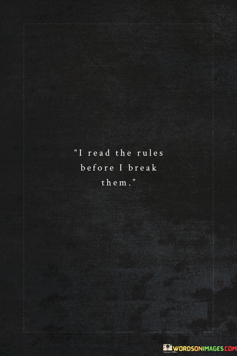 This quote suggests that the person is not a rebel without a cause; they're informed and deliberate about their actions. When someone says, "I read the rules before I break them," it means they take the time to understand the regulations, standards, or norms before intentionally deviating from them.