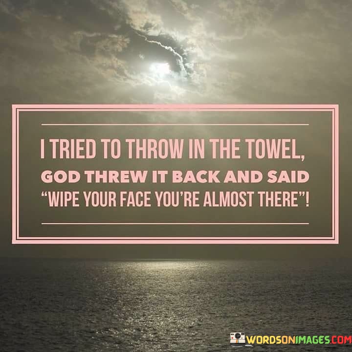 In essence, "I tried to throw in the towel, God threw it back and said, 'Wipe your face, you're almost there'" highlights the importance of faith, persistence, and the belief that divine intervention can provide the encouragement needed to overcome challenges and keep pursuing one's goals and dreams. It signifies the idea that God's presence can serve as a source of inspiration and strength during difficult times.