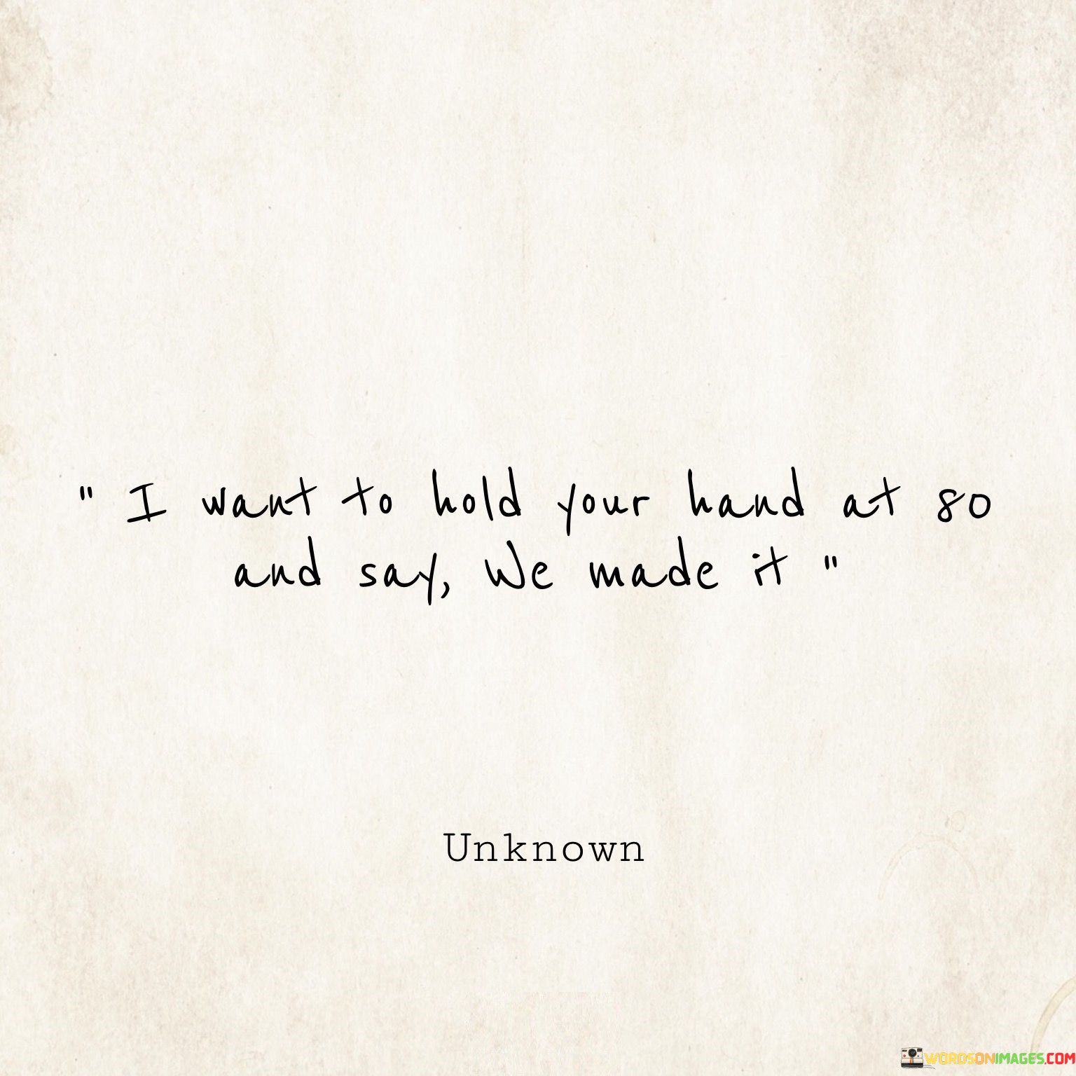 The quote emphasizes the significance of lasting companionship. It conveys the idea that the ultimate goal is not just to be together in the moment, but to traverse the various stages of life side by side. The image of holding hands at 80 symbolizes the desire for unwavering support, deep connection, and the joy of having weathered life's challenges together.