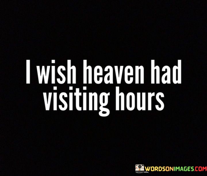 This quote expresses a longing to connect with someone who has passed away, as if there were visiting hours in heaven. It reflects the deep and unending love and affection one holds for the departed, wishing for a chance to see them again, even if just for a moment.