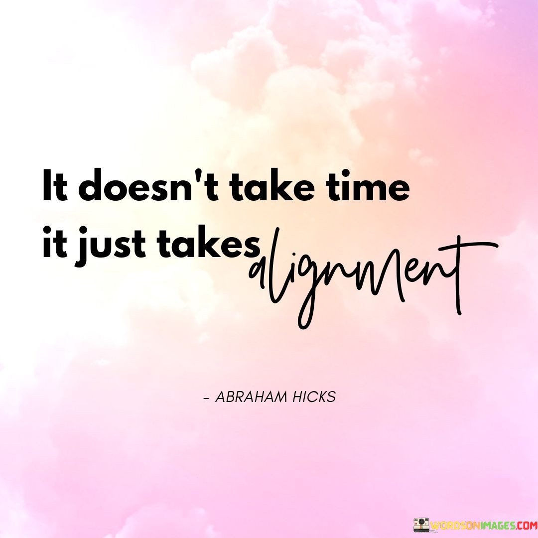 The quote emphasizes the importance of synergy. "It Doesn't Take Time" suggests that timing alone isn't the key factor. "It Just Takes Alignment" highlights the significance of elements working in concert. It underscores the efficiency of achieving desired outcomes when all necessary components are in harmony.
