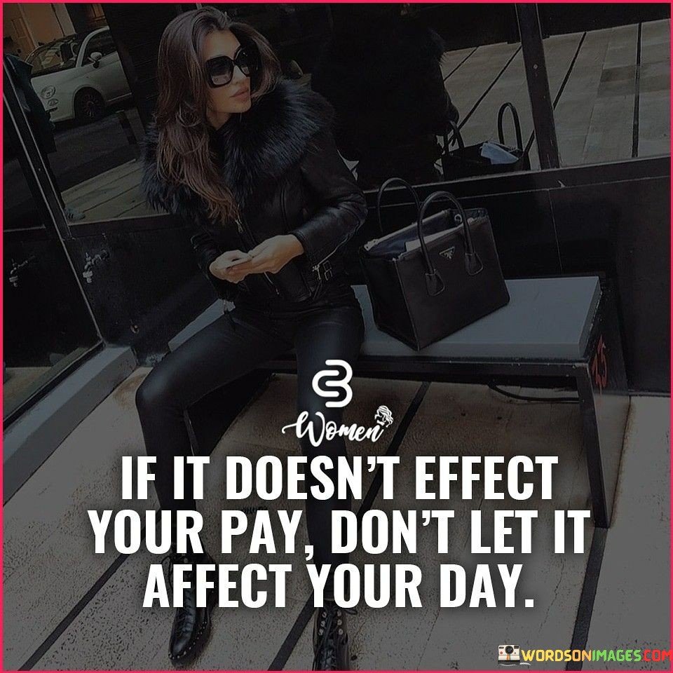 The quote "If it doesn't affect your pay, don't let it affect your day" emphasizes prioritizing one's focus and energy. It suggests that external factors with no direct impact on financial well-being shouldn't disrupt one's emotional state. This mindset promotes resilience and encourages efficient use of time and emotions.