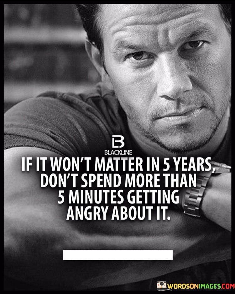 The quote "If it won't matter in 5 years, don't spend more than 5 minutes getting angry about it" offers a perspective on managing anger and frustration. It suggests that investing excessive energy into temporary issues is unproductive.