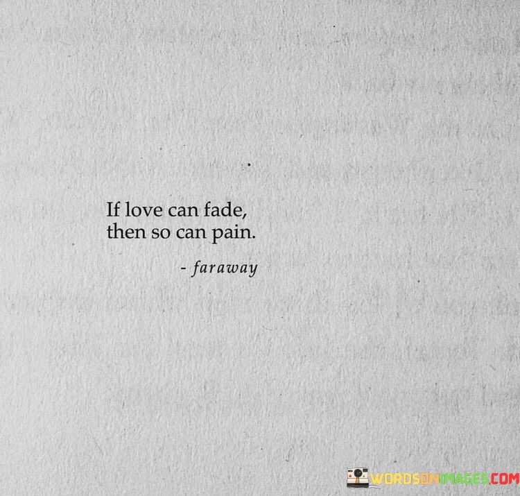 The quote "If love can fade, then so can pain" carries a profound message about the impermanence of emotions. It suggests that just as love, which is often considered a powerful and enduring emotion, can diminish or disappear over time, so too can pain. This notion encourages us to remember that painful experiences, no matter how intense they may feel, are not permanent fixtures in our lives.