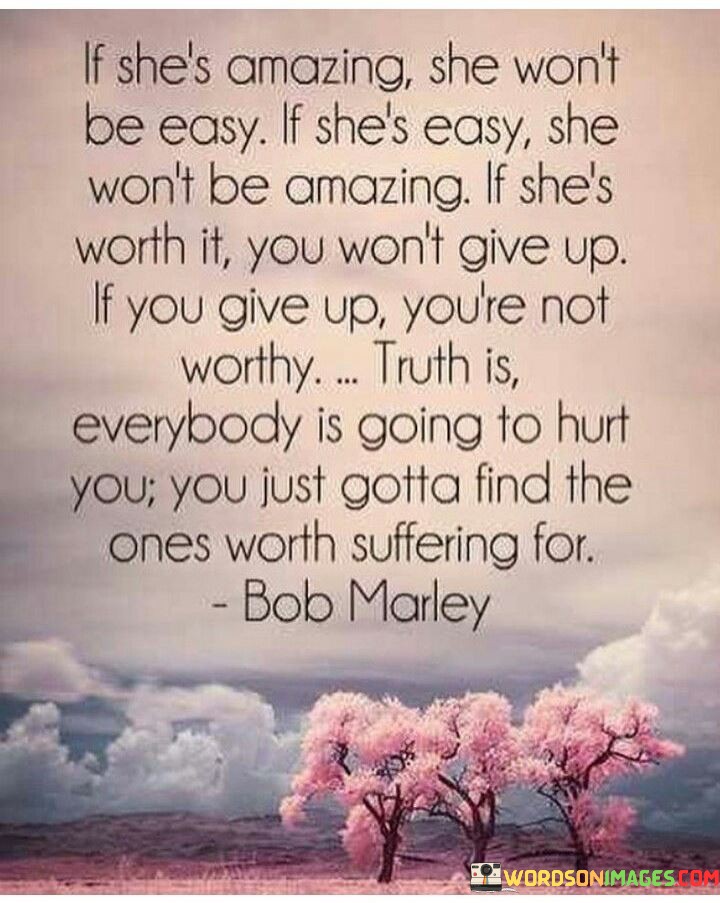 The quote "If she's amazing, she won't be easy. If she's easy, she won't be amazing. If she's worth it, you won't give up. If you give up, you're not worthy. Truth is, everybody is going to hurt you. You just gotta find the ones worth suffering for" captures the complex nature of relationships and the importance of resilience, determination, and discernment when it comes to finding meaningful connections. It suggests that true greatness and worthiness often require effort and commitment, and that while relationships can be challenging and painful, it is essential to identify and invest in those individuals who are genuinely worth the inevitable struggles and sacrifices.The quote challenges the notion that easy relationships are synonymous with greatness or worthiness. It implies that if someone is truly amazing, they are likely to require effort, understanding, and dedication to fully appreciate and embrace. It underscores the idea that genuine connections are not built on convenience or superficial ease but rather on the depth of emotional connection, mutual growth, and shared experiences.Furthermore, the quote emphasizes the importance of perseverance and resilience in relationships. It suggests that if someone is truly worth it, one should not give up easily but instead demonstrate commitment and determination to overcome challenges and work towards building a strong and meaningful connection. It implies that true worthiness lies in the willingness to put in the effort and endure difficulties in order to nurture a profound and lasting bond.Moreover, the quote acknowledges the reality that all relationships have the potential to cause hurt and pain. However, it highlights the importance of finding those individuals who are truly worth the suffering, indicating that not all pain is equal and that some relationships are worth the struggles and sacrifices they may entail. It emphasizes the need to discern and invest in relationships that bring genuine fulfillment, growth, and happiness, even amidst the inevitable hardships.In essence, the quote sheds light on the complexities of relationships and the pursuit of meaningful connections. It suggests that genuine greatness and worthiness require effort and dedication, and that one should not give up easily when faced with challenges. It acknowledges that relationships can bring hurt and pain, but encourages individuals to find those connections that are truly worth the inevitable suffering. Ultimately, the quote underscores the importance of discernment, resilience, and a willingness to invest in relationships that bring genuine joy, fulfillment, and mutual growth.