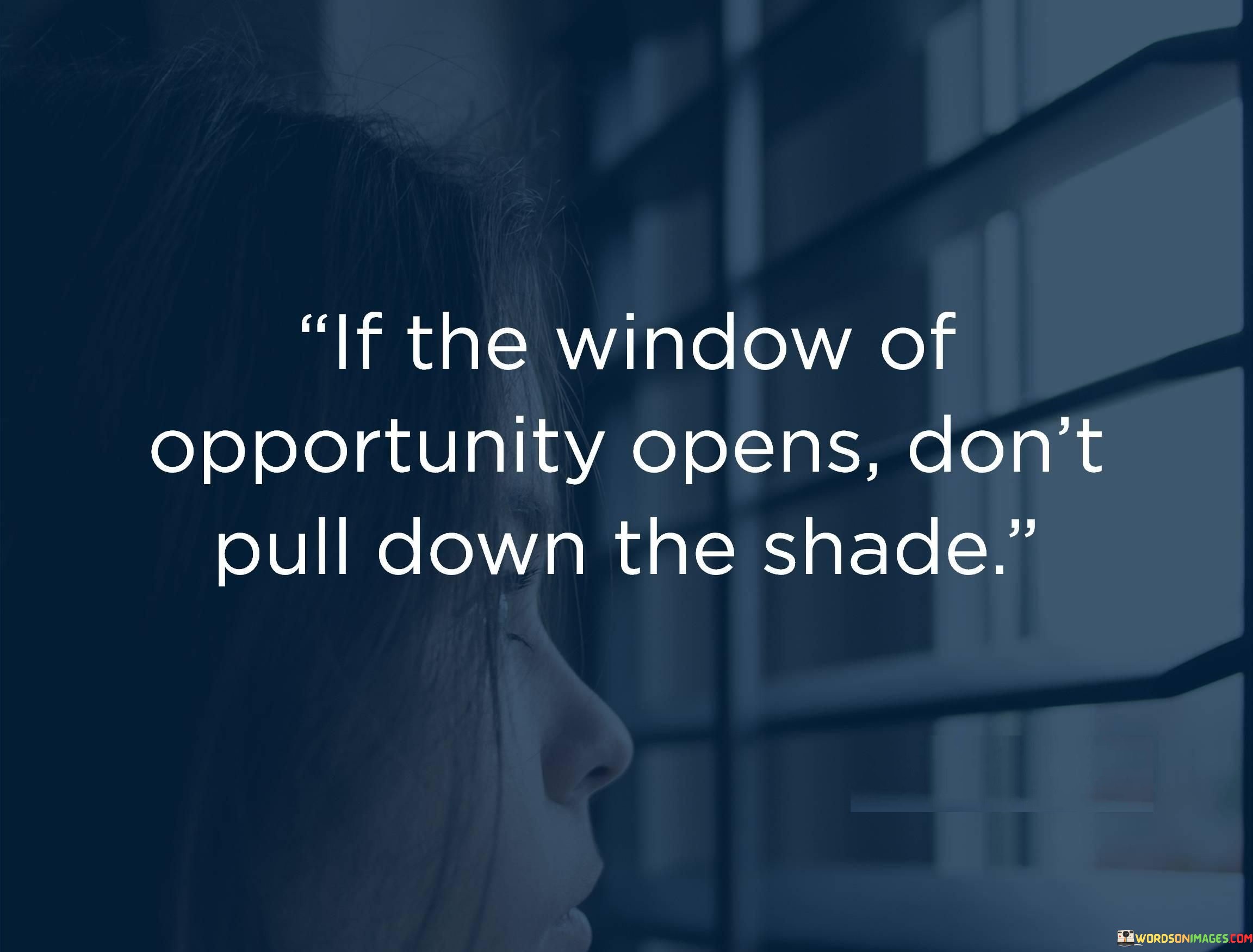 The metaphor of the "window of opportunity" symbolizes a brief and limited period in which something advantageous can be pursued or achieved. When this window opens, it implies that circumstances align favorably, presenting a chance for progress, growth, or success. The quote advises against missing out on such opportunities by "pulling down the shade," which signifies intentionally blocking or rejecting the chance at hand.