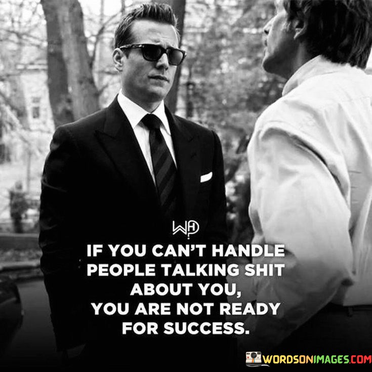 The quote "If you can't handle people talking shit about you, you are not ready for success" underscores the idea that success often comes with criticism and challenges.