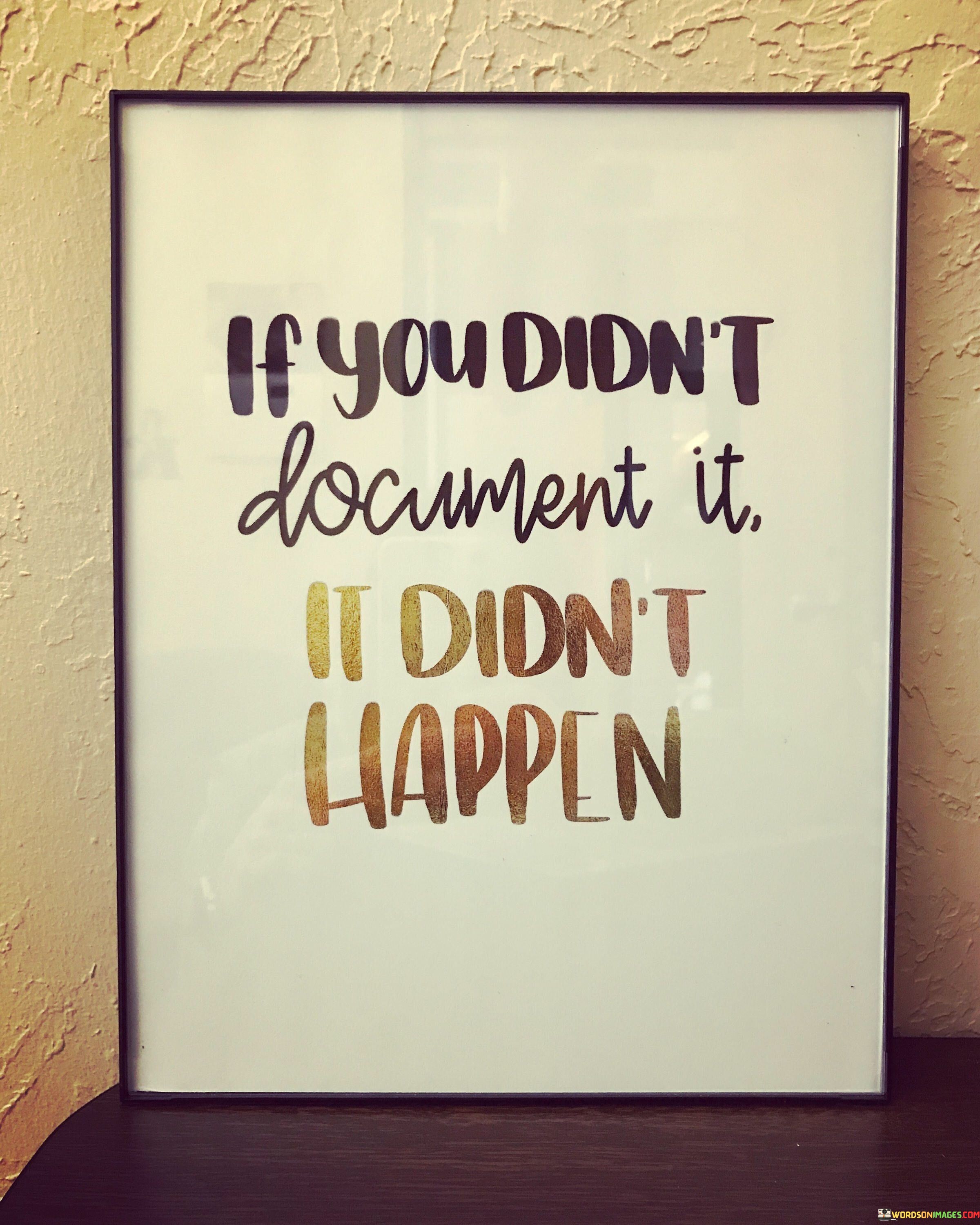 This quote emphasizes the importance of documentation in validating events or experiences. In today's digital age, it's easy to capture moments through photographs, videos, or written records. Think of documentation as the proof that something really happened, like a footprint in the sand confirming a person's presence.