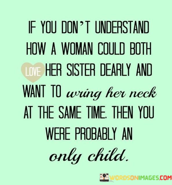 This quote humorously captures the complex and multifaceted nature of sibling relationships, particularly between sisters. It playfully suggests that if someone can't comprehend how a woman can simultaneously love her sister deeply and yet experience moments of frustration or annoyance with her, it might be because they haven't experienced the dynamics of siblinghood themselves, specifically as an only child. The quote highlights the unique blend of emotions that often characterize sibling relationships, where love, support, and loyalty coexist with moments of irritation or disagreement. It celebrates the complexities of sisterly bonds, recognizing that the love shared between siblings can be both profound and exasperating, and that this duality is an integral part of the sibling experience.
