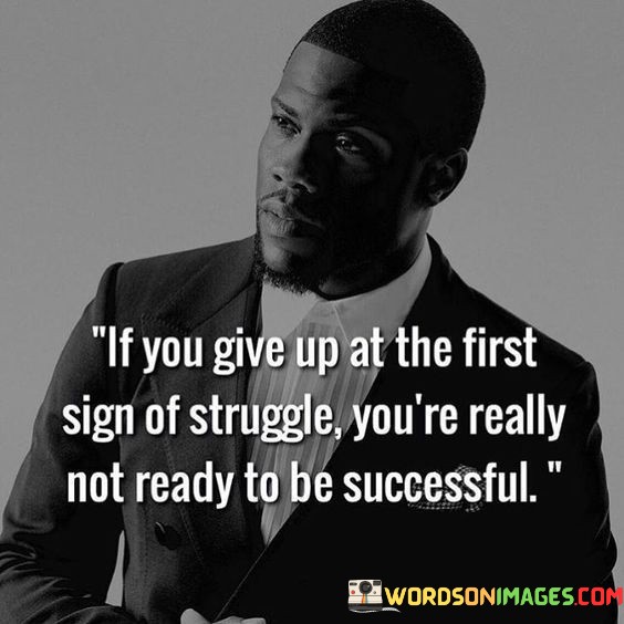 The statement "If You Give Up At The First Sign Of Struggle, You're Really Not Ready To Be Successful" underscores the importance of perseverance and resilience in the pursuit of success. It suggests that facing challenges and difficulties is an inevitable part of the journey, and those who quit too easily lack the readiness for true achievement.