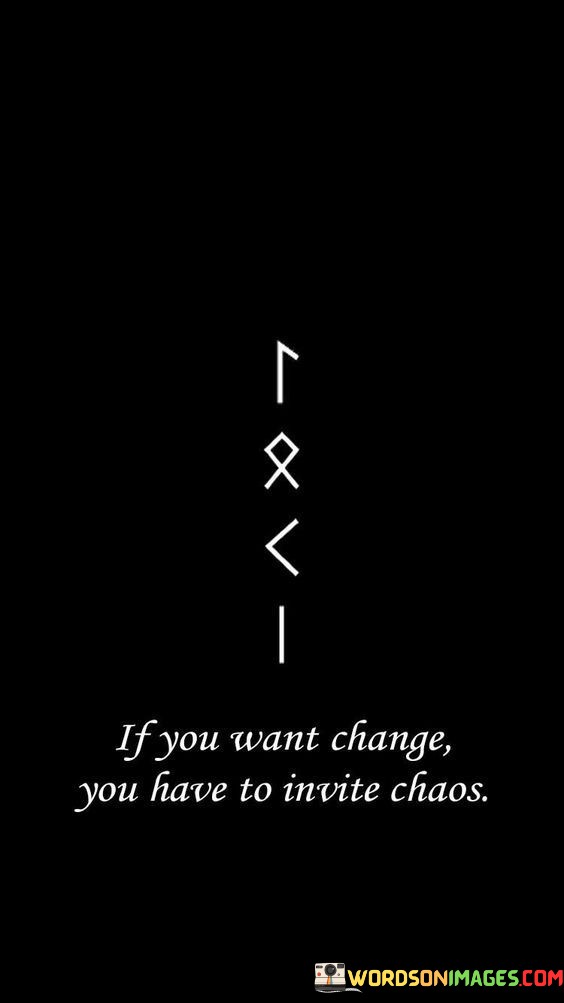 Embracing chaos for change is like planting seeds for growth. By inviting disruptions and challenges, you create the opportunity for progress. Just as a storm clears the air, chaos can clear the path for the change you seek. This quote encourages us not to fear chaos, but to see it as a stepping stone to the transformation we desire.