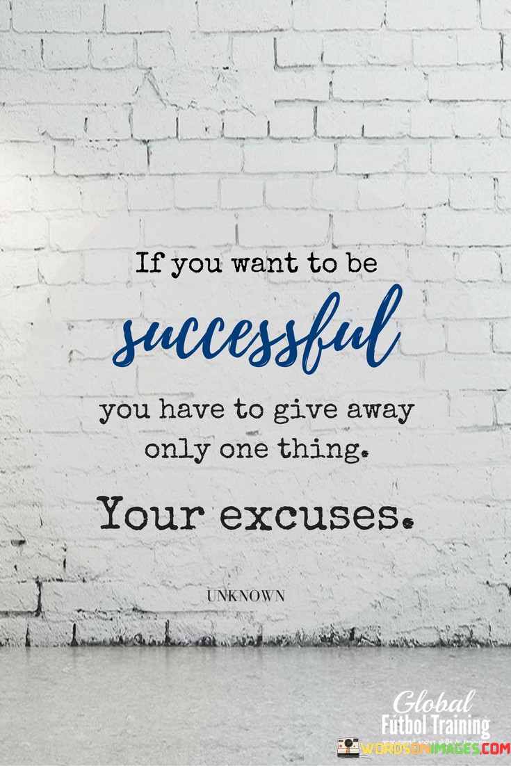It suggests that success requires a proactive and accountable mindset. Instead of making excuses for challenges or failures, individuals should take responsibility for their actions and decisions. By discarding excuses, they can channel their energy into finding solutions and working diligently towards their aspirations.
