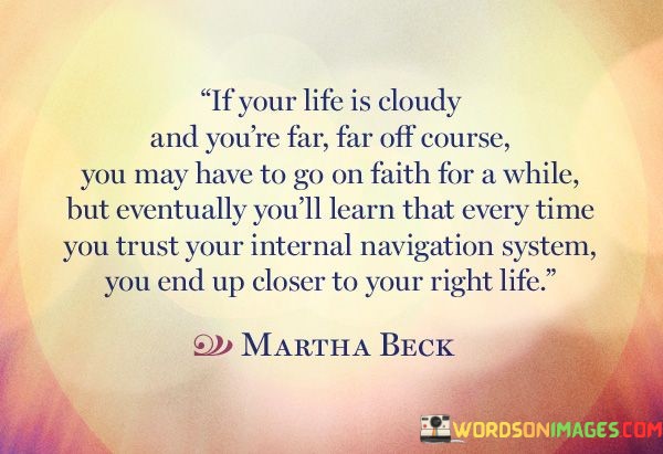The quote illustrates navigating uncertainty with faith and intuition. In the first paragraph, it introduces the scenario: "If your life is cloudy and you're far, far off course." This implies a state of confusion or disarray.
