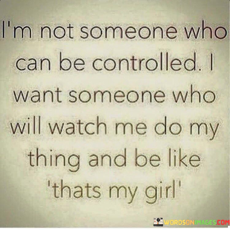 The quote "I'm not someone who can be controlled. I want someone who will watch me do my thing and be like, that's my girl" speaks to the desire for a partner who appreciates and supports one's independence and individuality. In 300 words, we can delve into the meaning behind this statement and its emphasis on autonomy and mutual admiration.
