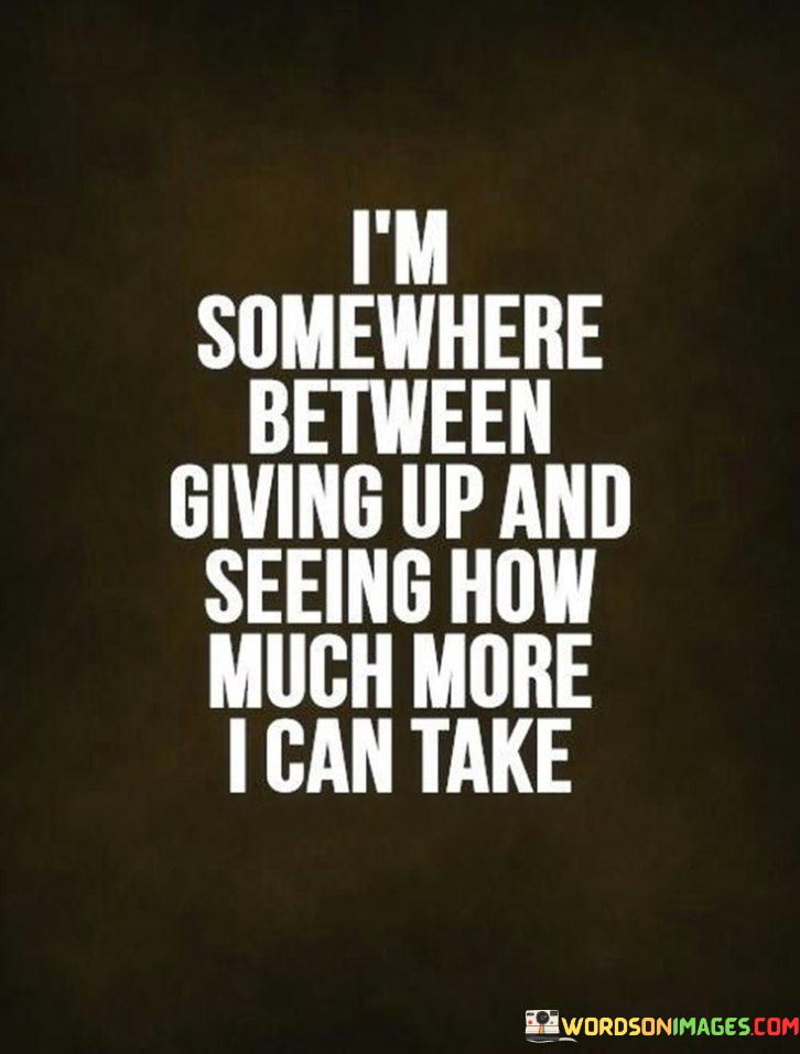 The quote reflects a state of internal conflict. "Somewhere between giving up" alludes to exhaustion. "Seeing how much more I can take" signifies endurance. The quote conveys the struggle between surrendering and persevering in the face of challenges.