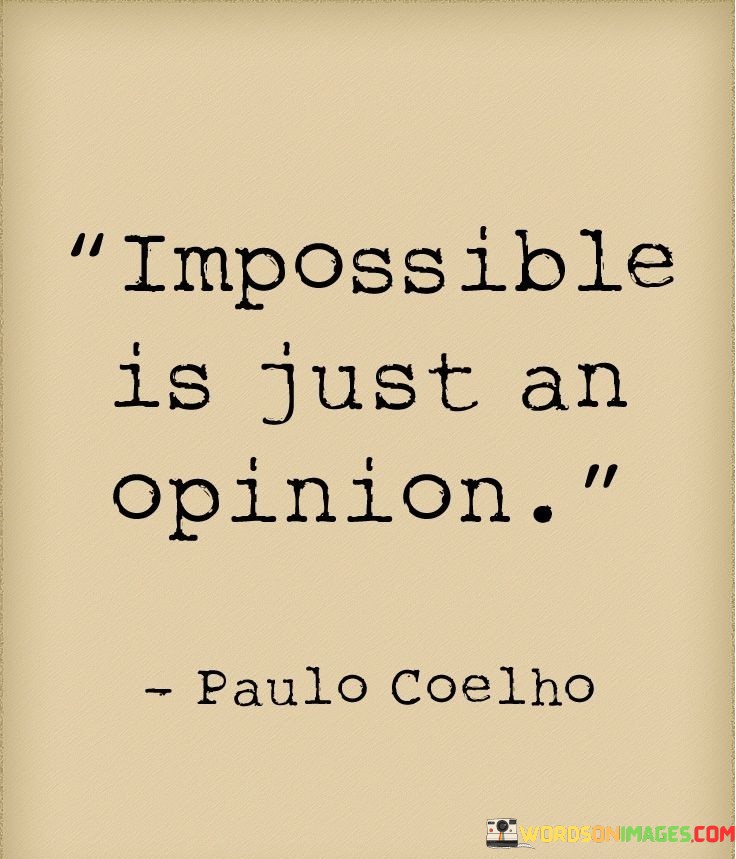 The quote "Impossible Is Just An Opinion" conveys a powerful message about the nature of limitations and challenges. In essence, it suggests that the concept of impossibility is not an objective reality but rather a subjective viewpoint or belief. What one person may perceive as impossible, another may see as a challenge waiting to be overcome.