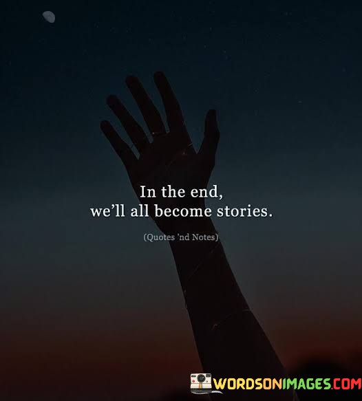 This quote, "In The End We'll All Become Stories," reminds us of the impermanence of life and the enduring power of storytelling. It suggests that, ultimately, our lives will be remembered and shared through the stories we leave behind.