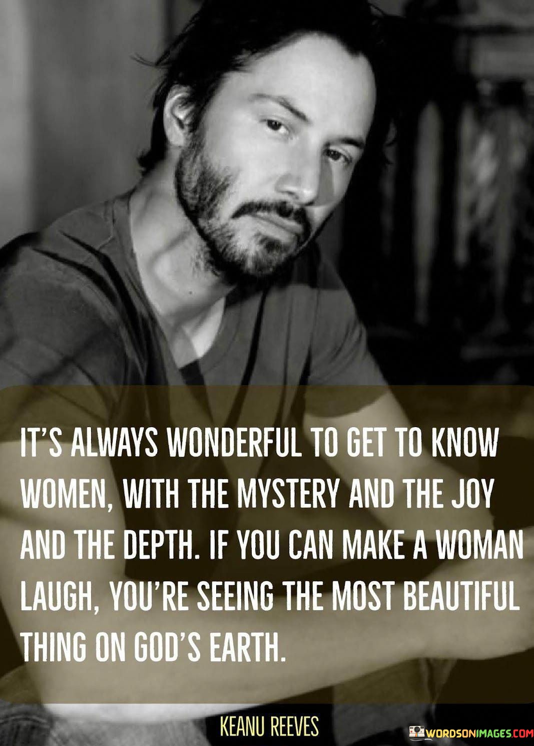 The quote "It's always wonderful to get to know women, with the mystery and the joy and the depth. If you can make a woman laugh, you're seeing the most beautiful thing on God's earth" celebrates the complexity and beauty of women. It appreciates the enigmatic nature of women, acknowledging the joy and depth they bring to life.