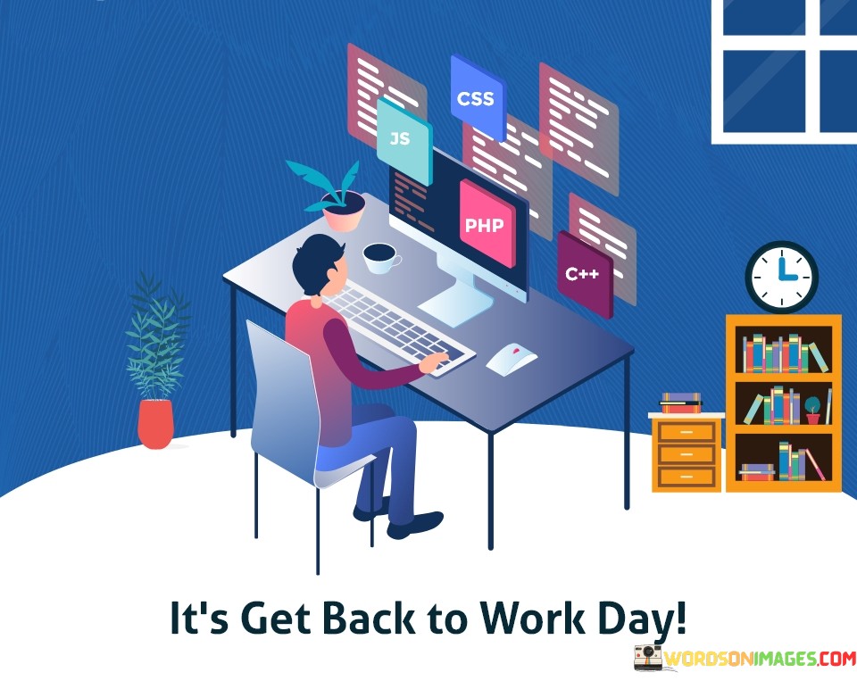 "It's Get Back to Work Day" signifies a return to the grind after a period of rest or leisure. This quote underscores the importance of diligence and productivity, emphasizing that it's time to refocus on tasks and responsibilities.