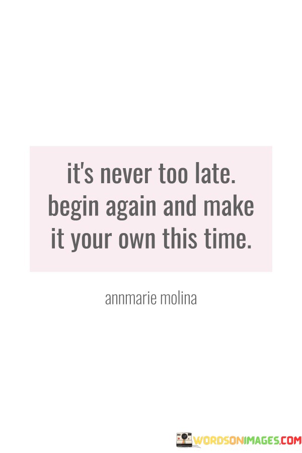 Sometimes, we might feel like we've missed our chance or that time has passed us by, but this quote reminds us that every moment can be a fresh beginning. Whether it's a new career path, a hobby, or a personal goal, we have the power to make it our own time, regardless of our age or past experiences.