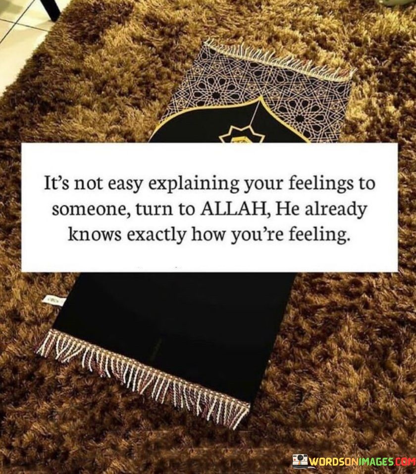 The quote encourages individuals to find comfort and support in their faith, believing that God is aware of their feelings and can provide guidance and solace even when human communication falls short.