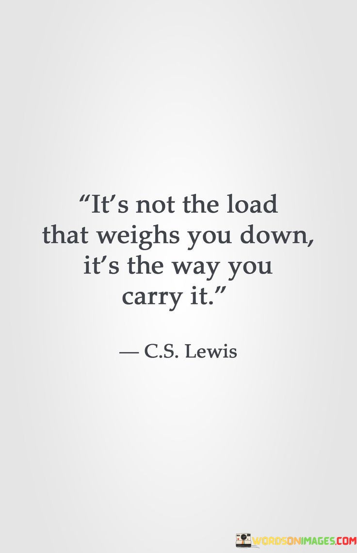 The burden itself isn't what makes you feel heavy – it's how you handle it. This quote illustrates that our perspective and approach determine how challenges affect us. It's like carrying a backpack – how we distribute the weight matters more than its size.