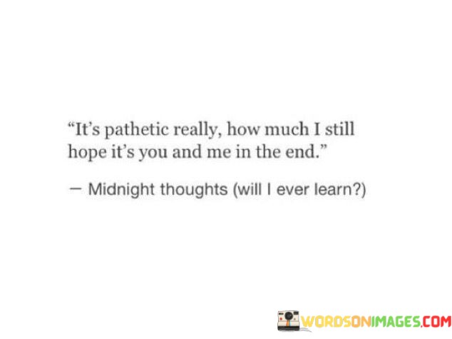 The quote "It's pathetic really how much I still hope it's you and me in the end" reflects a profound sense of longing and nostalgia for a past relationship or connection. It suggests that despite the passage of time and possibly moving on, the speaker still holds onto the hope that they will reunite with the person they once loved.