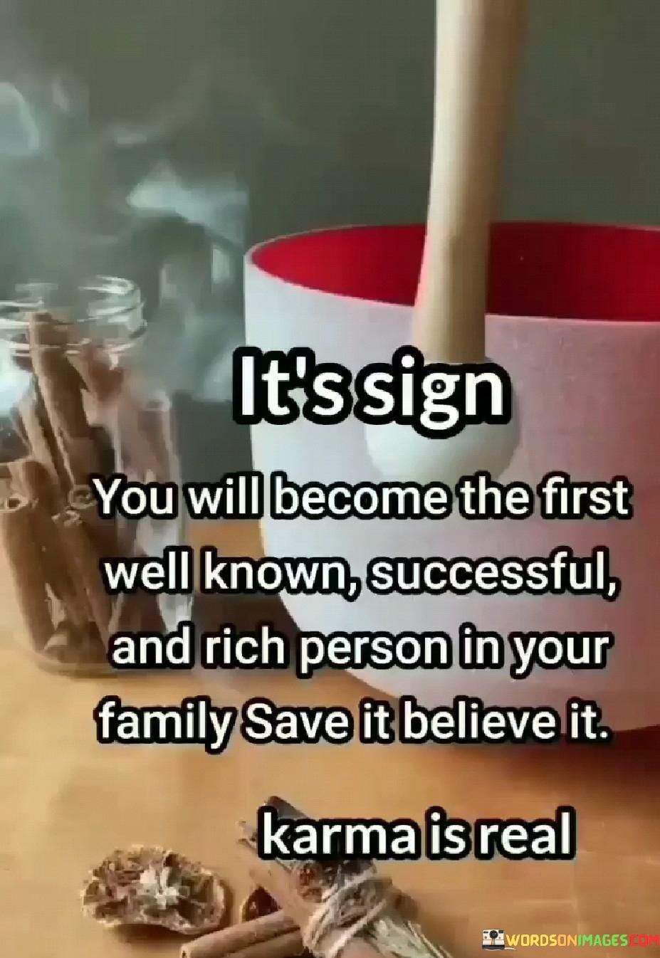 The quote reflects on potential and self-belief. "First well-known successful and rich person in your family" implies achieving significant success. "Save it, believe it" emphasizes holding onto this vision and having faith in it. The quote encourages self-confidence and determination.