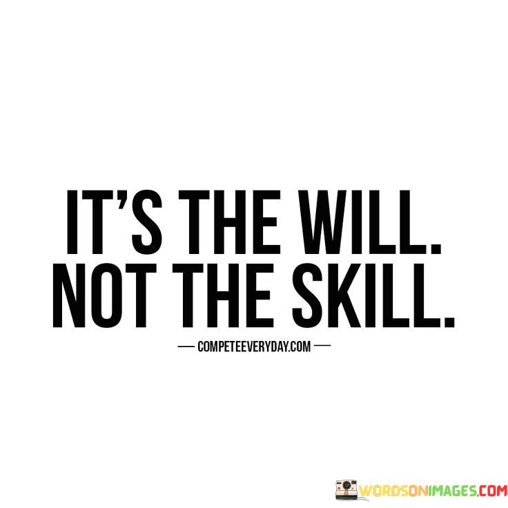 "It's The Will Not The Skill" serves as a reminder that one's attitude and determination can make all the difference. It encourages individuals to cultivate a strong sense of purpose and commitment towards their objectives. It implies that with unwavering determination, even those lacking certain skills can bridge the gap through learning and perseverance.