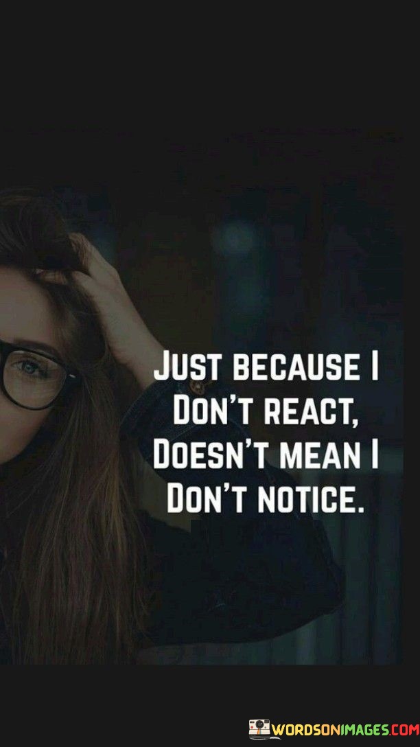 This quote emphasizes that a lack of visible reaction from someone doesn't indicate that they are oblivious to what's happening around them. It's a reminder that people can be observant and perceptive even when they don't show an immediate emotional response.