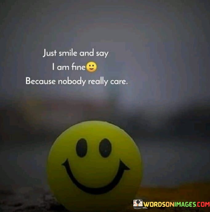 The quote "Just Smile And I Am Fine Because nobody really care" carries a poignant message about how individuals often mask their true feelings behind a smile. It suggests that when someone asks how you are and you respond with a smile and the assurance that you're fine, it's because you believe that others may not truly care about your deeper emotions and struggles.
