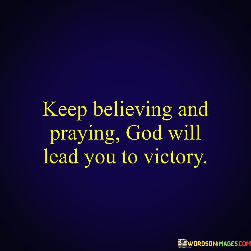 This quote conveys a message of perseverance and faith. It encourages individuals to maintain their belief in a higher power and to continue praying, as these actions are seen as a pathway to achieving victory.