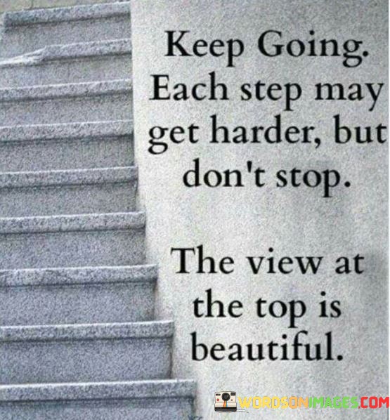 The quote, "Keep going. Each step may get harder, but don't stop. The view at the top is beautiful," imparts a powerful message about perseverance, resilience, and the rewards of staying committed to our goals and aspirations. It encourages us to push forward despite the challenges and obstacles we may encounter along the way. The quote draws an analogy to climbing a mountain, where each step requires effort and determination. It reminds us that the path to success is rarely smooth, and we may face difficulties and setbacks that test our resolve. However, the quote urges us not to give up, as the view from the top, symbolizing our achievements and the realization of our dreams, is a sight of immense beauty and fulfillment. By persevering through hardships and staying focused on our objectives, we can overcome adversity and reach a place of triumph and gratification. Ultimately, the quote serves as a motivational reminder of the significance of resilience, courage, and unwavering commitment in pursuing our aspirations and reaping the rewards of our efforts at the summit of our journey. At its core, the quote celebrates the virtue of perseverance. It acknowledges that the journey towards our goals may become increasingly challenging, akin to climbing a mountain where each step demands more effort and determination. The quote recognizes that success often requires us to navigate through obstacles, face self-doubt, and endure setbacks. Moreover, the quote speaks to the importance of resilience. It urges us not to be deterred by the difficulties we encounter on our path but to maintain the courage and resilience to keep moving forward. By persevering through adversities, we strengthen our resolve and build the mental and emotional fortitude necessary to face future challenges. Furthermore, the quote underscores the rewards of perseverance and dedication. Just as the view from the top of a mountain is breathtaking and awe-inspiring, the realization of our goals and aspirations brings a sense of accomplishment and fulfillment. By staying committed to our journey and overcoming obstacles, we can savor the beauty of our achievements and the growth we experience along the way. In conclusion, the quote "Keep going. Each step may get harder, but don't stop. The view at the top is beautiful" serves as an inspiring reminder of the power of perseverance, resilience, and commitment in pursuing our dreams and aspirations. It encourages us not to be disheartened by the challenges we encounter but to keep pushing forward with unwavering determination. Just as the view from the top of a mountain is rewarding and beautiful, the journey towards our goals is equally fulfilling and enriching. By embracing the struggles and staying dedicated to our objectives, we can reach a place of triumph and satisfaction, where the realization of our dreams becomes a reality. This quote serves as a motivating call to press on, face adversity head-on, and enjoy the immense beauty of the achievements that await us at the summit of our journey.