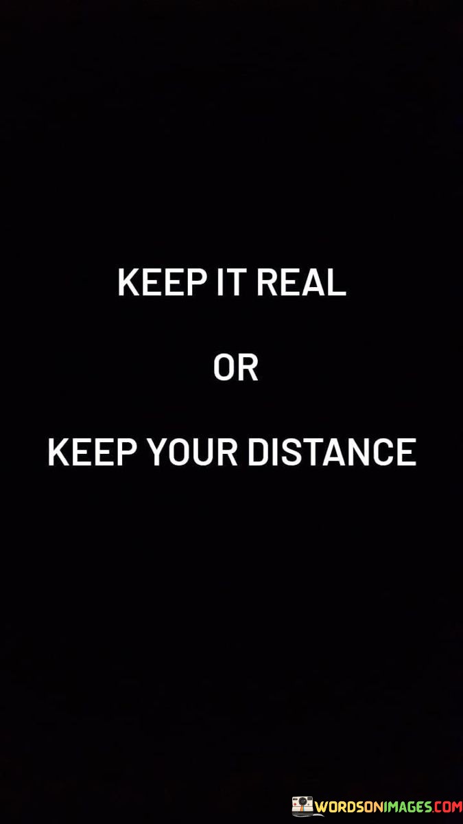 In summary, "Keep It Real Or Keep Your Distance" is a reminder to be authentic and truthful in your relationships. It's a way of saying that honesty and genuineness are crucial for building meaningful connections with others. If someone isn't being real with you, or if you feel that being yourself is not accepted, it's okay to maintain some distance to protect your own well-being and integrity.