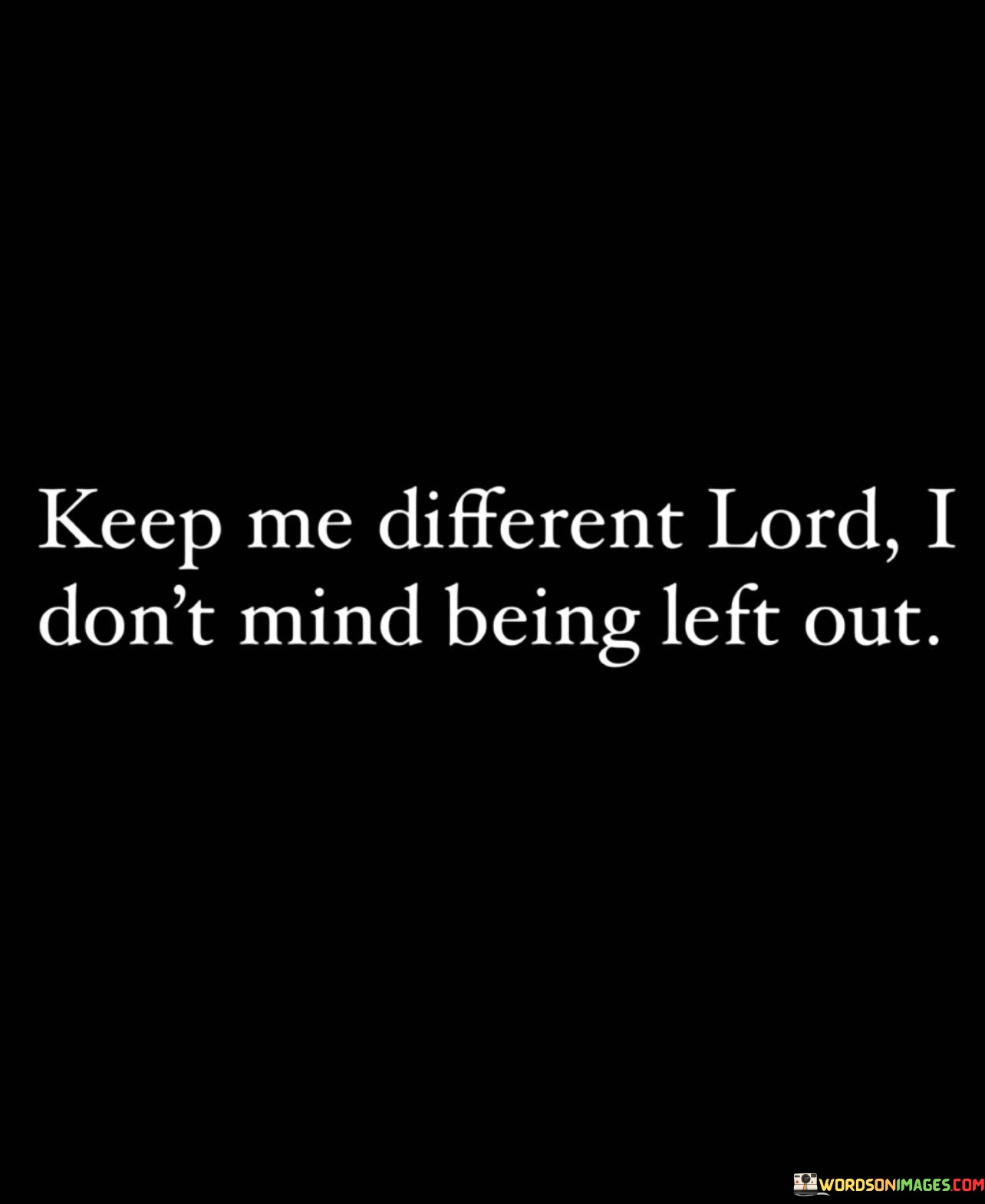 The quote "Keep Me Different, Lord, I Don't Mind Being Left Out" conveys a message of embracing one's uniqueness and individuality, even if it means not conforming to societal norms or being in the mainstream. It suggests a willingness to stand out and be different, trusting that God's plan for one's life may involve a distinct and unconventional path.