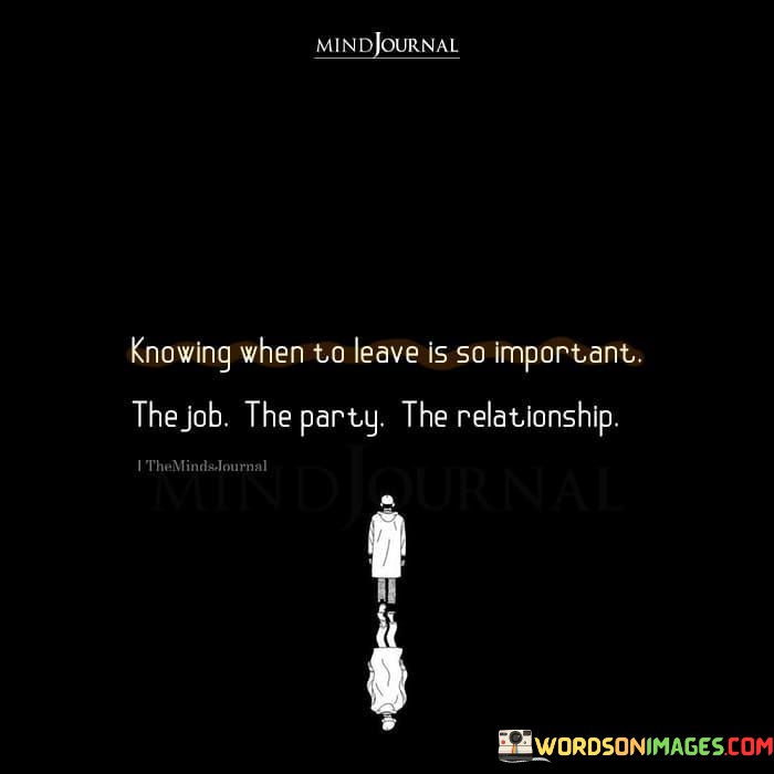 In the context of a job or career, knowing when to leave can have a significant impact on one's personal and professional growth. Staying in a job that no longer aligns with your goals, values, or aspirations can lead to dissatisfaction and stagnation. This quote encourages individuals to assess their current job situations and be willing to make changes when necessary for their own well-being and advancement.