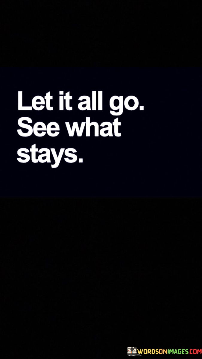 The quote "Let It All Go, See What Stays" encourages us to release the things that burden us and observe what remains. It's like cleaning out a cluttered room, throwing away what's no longer needed, and keeping only what truly matters. This quote suggests that by letting go of unnecessary worries, possessions, or thoughts, we can discover what holds true value in our lives.