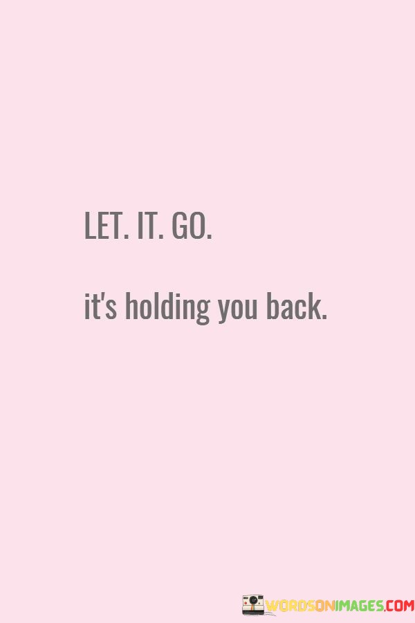 The quote, "Let it go, it's holding you back," advises us to release our grip on things that are hindering our progress. It's like dropping a heavy bag you've been carrying for too long, giving you the freedom to move forward unburdened. Holding onto things that no longer serve us can keep us stuck in the past and prevent us from reaching our full potential.