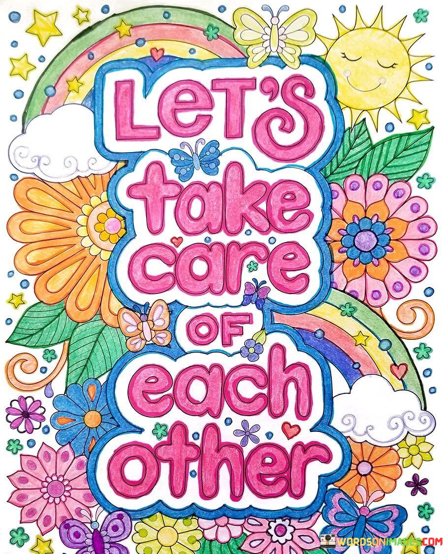 This quote highlights the importance of looking out for one another. It suggests that we should show kindness and support. Just like friends helping, let's care for those around us. It's about creating a community of care.