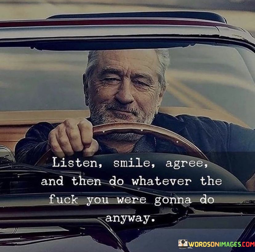 The quote "Listen, Smile, Agree, and Then Do Whatever the Fuck You Were Gonna Do Anyway" carries a tone of defiance and independence. It suggests a strategy of appearing agreeable in the moment, but ultimately following your own intentions without being swayed by others' opinions.